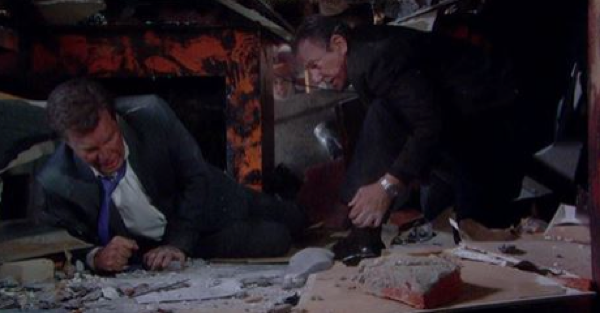 Monday’s episode opens with a flashback from Friday’s episode – Jack [Peter Bergman] and Victor [Eric Braeden] are bickering about who will be leaving from the rubble they are trapped in then suddenly the ceiling collapses.