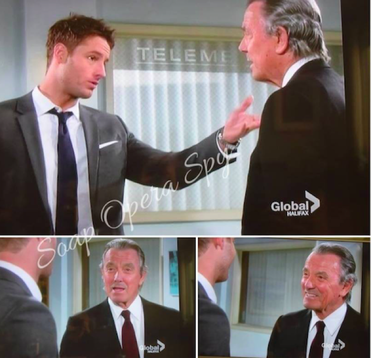 Wednesday’s episode of Y&R opens with Flack [Peter Bergman] and Victor [Eric Braeden]. Gabriel [Justin Hartley] walks in and sees Victor with the syringe he asks Victor, “what the hell are you doing.” Victor asks him to go outside. Gabriel goes out with Victor and says, “What the hell, you were trying to kill him?” Victor says, “WHAT?”