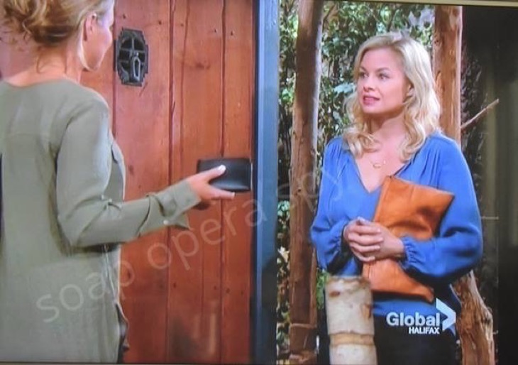 Sharon folds the blanket on the couch where they were sleeping and finds Dylan’s wallet. The door knocks and she says as she opens it, “I know what you came back for Dylan this must of fallen out of your pants…” It is Avery
