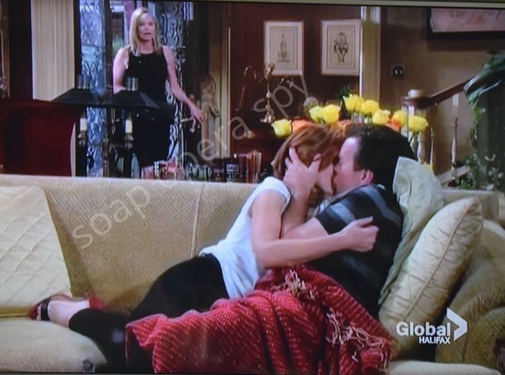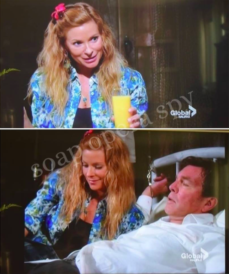 The Thursday episode of Y&R opens up with crazy Kelly [Cady McClain] mixing drugs in Real Jack’s [Peter Bergman] Orange juice – she asks him if he slept well and she gives him the drugged orange juice. Kelly toasts their long and happy marriage. She reminds him about dancing the night before and how they got married. She tells him he does not need to go anywhere she is his family now and gives him more drugged orange juice.