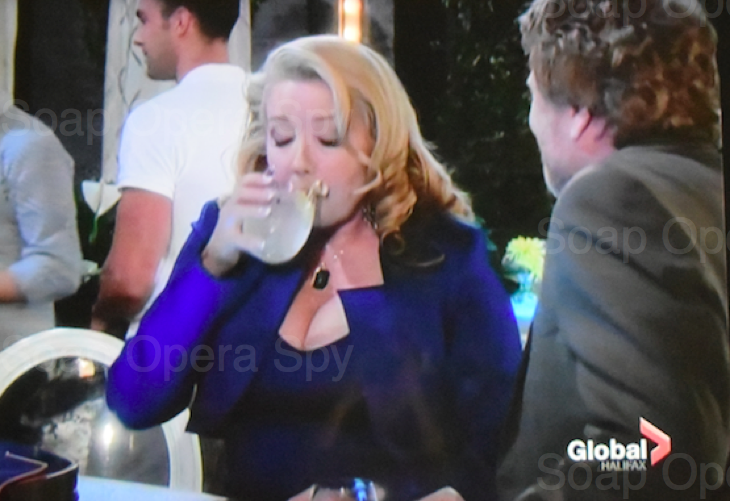 Victor calls for a toast and Nikki says not me and Sage says you don’t have to not drink for me and she says nastily, “I don’t think AA would like it.” Nikki leaves…