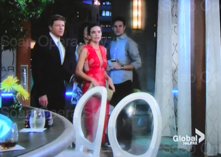 Today’s episode of Y&R opens with Tobias [Jeffrey Christopher] walking into the Newman/Abbot merger party. Victor [Eric Braeden] tells him to leave Ashley [Eileen Davidson] tells him she is going to have him arrested. Flack [Peter Bergman] walks up to Tobias and tells him they don’t need spies anymore they are one company NOW.