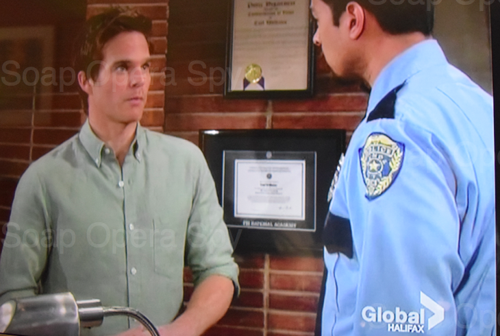 Kevin [Gregg Rikaart] is on Paul’s [Doug Davidson] computer and he finds something he wants to print an officer walks in and asks Kevin, “What are you doing on the chief’s computer?”