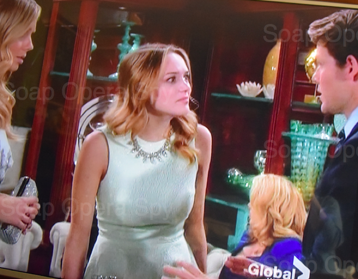 Nick [Joshua Morrow] comes to see Sage [Kelly Sullivan] who is dressed up for the party. Nick tells her the family at the party is not fun. She wants to go to support him with his family. Since thier baby will be their family too. Nick tells her he has told everyone she is pregnant.