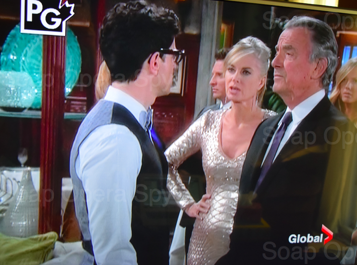 Tobias lifts his glass of champagne and says he is revealing the intimate details of the Genoa City residents. “Money, entitlement but these people think they know everything. This man right here….” he points to Victor and Victor says, “it is enough!” Billy [Burgess] Jenkins} says, “Shucks Victor it cannot hurt to hear him out!”