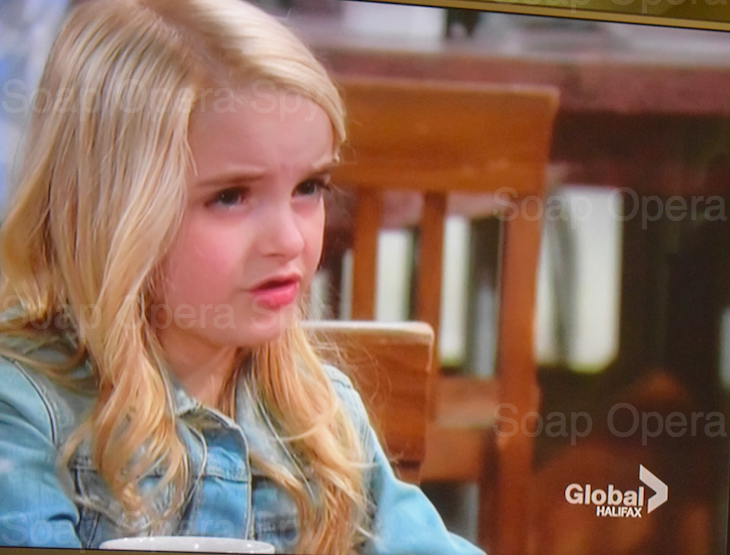 Faith asks Sharon when the baby is coming? Nick tells Faith that Sharon is not having a baby. Nick tells Faith Sage and him are having a baby and Faith says, “What! You should be having a baby with Mommy NOT HER.” Nick tells her THAT IS ENOUGH! Faith says, “You cannot force me” Sharon tells Faith she has to get use to the fact that Daddy and Sage are going to have a baby and she is going to be a big sister. Faith tells Sharon she does not want to spend nights with Daddy any more and Nick tells her she has to and Sage pipes up, “well maybe you could spend nights with Mommy!”