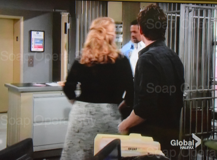 Nikki [Melody Thomas Scott] runs into the police station she is there to bail out Neil [Kristoff St John] – he was arrested for hitting the drunk who Nikki was it at the bar. Neil tells her Leslie [Angell Conwell] already got him out Kevin tells him the GC news picked up the story of him being arrested. Neil tells Nikki not to worry about him but they are also probably reporting she was a fall down drunk.