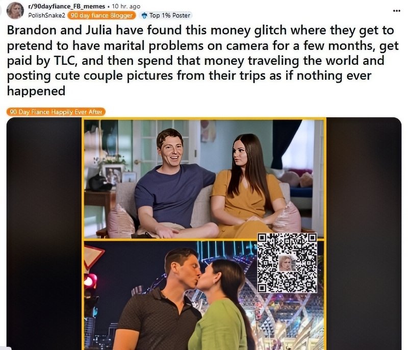 Brandon and Julia have found this money glitch where they get to pretend to have marital problems on camera for a few months, get paid by TLC, and then spend that money traveling the world and posting cute couple pictures from their trips as if nothing ever happened.