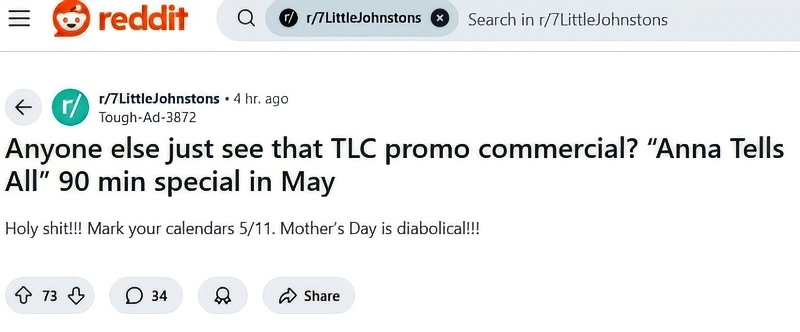 The news that TLC dropped an advertisement about a TLC Tell-All by Anna got a few people excited. When it arrived second-hand on Reddit, the OP wrote, “Anyone see that TLC promo commercial? “Anna Tells All” 90 min special in May…Holy s**t!!! Mark your calendars 5/11. Mother’s Day is diabolical!!!”