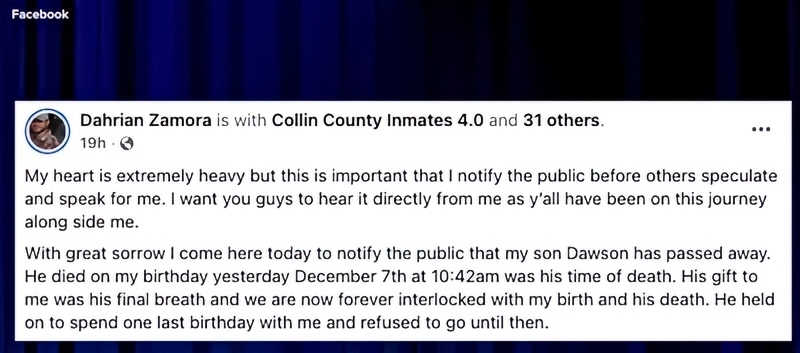 My heart is extremely heavy, but this is important that I notify the public before others speculate and speak for me. I want you guys to hear it directly from me, as y’all have been on this journey alongside me. With great sorrow, I come here today to notify the public that my son Dawson has passed away. He died on my birthday yesterday, December 7th, at 10:42 a.m. That was his time of death. His gift to me was his final breath and we are now forever interlocked with my birth and his death. He held on to spend one last birthday with me and refused to go until then.