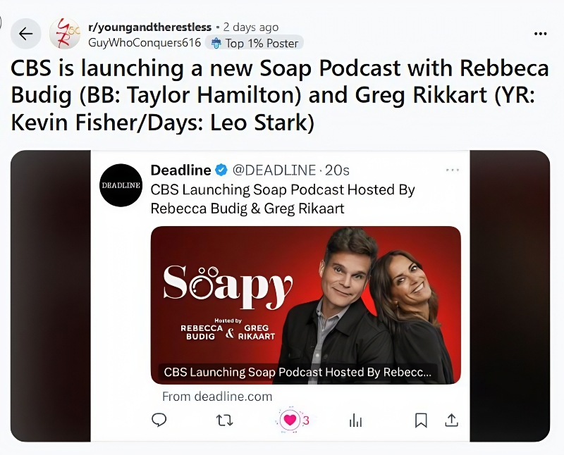 Paramount Press Express revealed the new podcast will start airing on July 8 and will “run through September 30th, 2025.” It’s hosted by “Greg Rikkart,” known for his roles as Leo Sark and Kevin Fisher on Days of Our Lives and The Young and the Restless, Then there’s “Rebbeca Budig,” who played Taylor Hamilton on The Bold and the Beautiful.