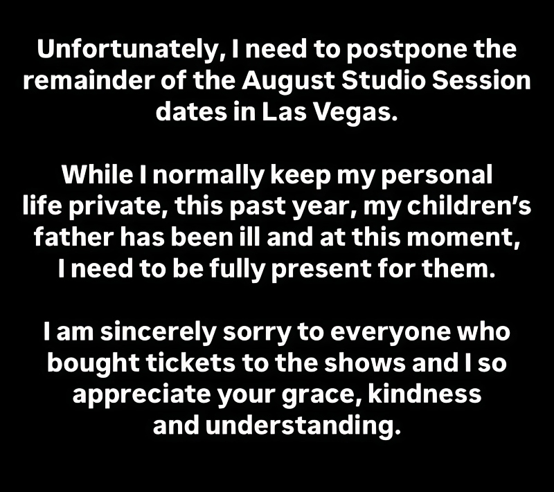 While I normally keep my personal life private, this past year, my children’s father [ex-husband Brandon Blackstock] has been ill and at this moment, I need to be fully present for them. I am sincerely sorry to everyone who bought tickets to the shows, and I so appreciate your grace, kindness, and understanding.