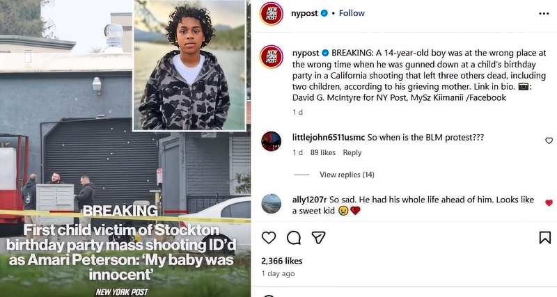 When the New York Post shared their story on Instagram, many people reacted to the news about Amari Peterson who died at the Stockton birthday party. One person wrote, “So sad. He had his whole life ahead of him. Looks like a sweet kid.”