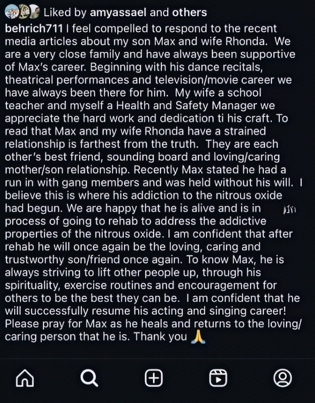 Max Ehrich’s dad also dismissed media reports that claimed that Rhonda and Max “have a strained relationship.” In fact, he stressed that such reports are “farthest from the truth.” And, he continued by saying, “They are each other’s best friend, sounding board and loving/caring mother/son relationship.”
