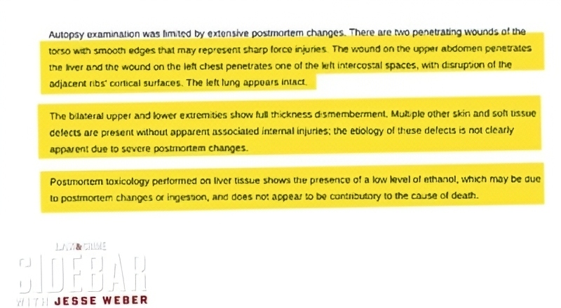 On Law&Crime Network, Jesse Weber spoke with a forensic pathologist who broke down the findings. The report detailed two wounds to the torso with “smooth edges.” Notably, that could indicate a sharp object caused them.