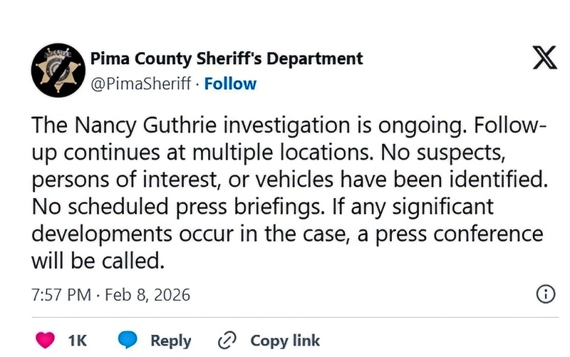 The Nancy Guthrie investigation is ongoing. Follow-up continues at multiple locations. No suspects, persons of interest, or vehicles have been identified. No scheduled press briefings. If any significant developments occur in the case, a press conference will be called.